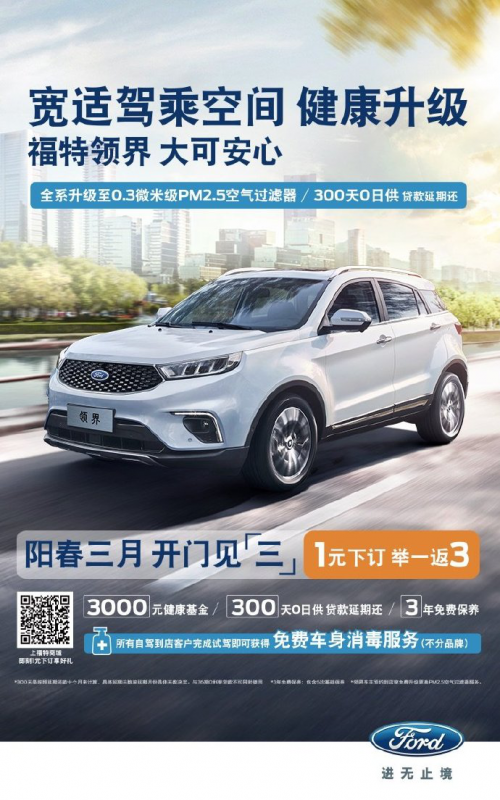 如今疫情当前,领界贴心守护,现推出远程看车服务,足不出户,也可全方位了解福特领界车型细节,通过福特官网、福特商城、汽车之家等多平台线上看车、在线选车。还提供线上贷款审批,足不出户就可以办理全流程。即日起至3月31日,福特商城一元下订,尽享3重豪礼,其中包含3000元健康基金方案、300天0日供延期还贷款以及3年免费保养。另外,任意车型的老车主置换领界,即可享受2000元/台的置换补贴,免费车身消毒及升级至0.3微米级PM2.5空气过滤器。(详情请咨询当地经销商)